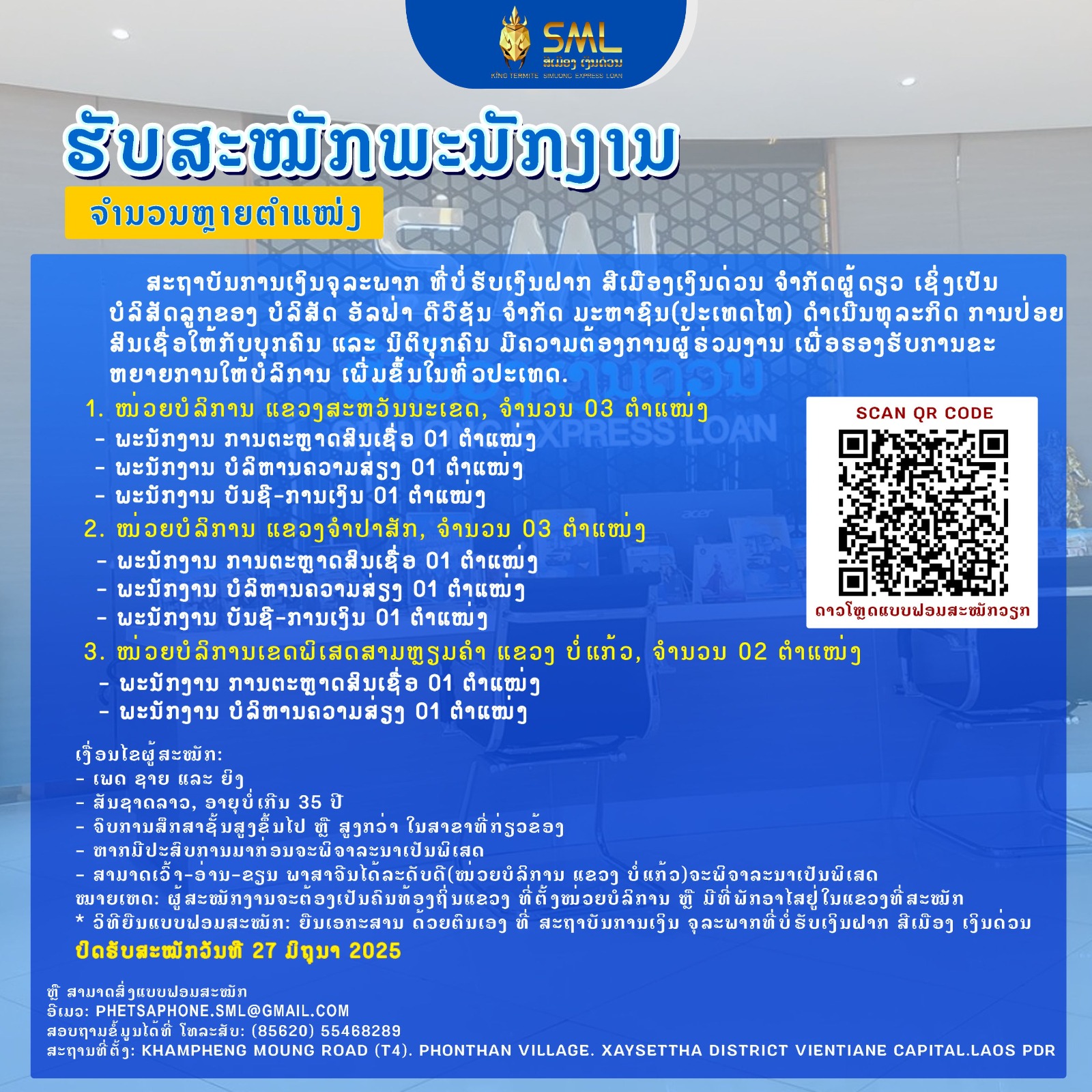 • ສະຖາບັນການເງິນຈຸລະພາກ ທີ່ບໍ່ຮັບເງິນຝາກ ສີເມືອງ ເງິນດ່ວນ ປະກາດຮັບສະໝັກງານ ເພື່ອນຮ່ວມງານ ຫຼາຍຕຳແໜ່ງ